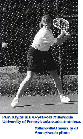 After nearly a quarter-century away from the classroom, Pam Kaylor has proved that one is never too old to return to an academic environment -- or never too old to play competitive tennis at the collegiate level.