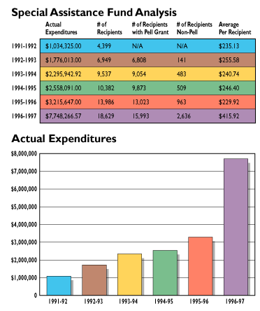 The amount of money provided through the NCAA's special assistance fund has increased by seven times since the fund's inception in the 1991-92 fiscal year. In 1996-97, the NCAA distributed $7.7 million to qualified Division I student-athletes with unmet financial needs. That figure was more than double the outlay from the previous year. In addition, the average per recipient also increased sharply, rising from about $229 per recipient to $415. At its most recent meeting, the Division I Management Council approved a recommendation from the Business/Finance Cabinet to make the fund available to all qualifying Division I student-athletes receiving any athletically related aid. In addition, the Management Council requested research on the financial ramifications of providing access to the fund for all Division I student-athletes, regardless of whether they receive athletics aid.