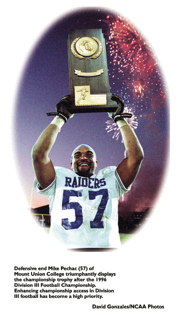 "I think the key variable that fits our philosophy is access," said James R. Appleton, president of the University of Redlands and a member of the Division III Management Council. "One of the important variables that is being considered is increasing the access for some postseason play to a ratio of conferences and independents that do play football that is somewhat closer to the ratio we like to see for other team sports in Division III, which is about a 1:8 ratio."