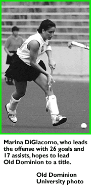 Overview: Old Dominion, which won three consecutive championships from 1990 through 1992 but has not appeared in a title game since then, is ranked No. 1. The Lady Monarchs' only loss was against third-ranked Maryland, 3-2, after two penalty-stroke sessions. Marina DiGiacomo leads the offense with 26 goals and 17 assists. With the exception of the Maryland game and a 5-4 overtime win against two-time defending champion North Carolina, no team has come closer to Old Dominion than two goals. Old Dominion has blanked 11 opponents behind the .855 saves percentage of Staci Smith .... Virginia has beaten everyone on its schedule but Old Dominion, including two victories over North Carolina and one over Maryland. The Cavaliers are led by Meridith Thorpe, who has 19 goals and four assists. Michelle Vizzuso has a team-leading 15 assists and has contributed eight goals. Goalkeeper Becky Worthington ranks first nationally in saves percentage (.900) and goals-against average (.375) .... Third-ranked Maryland (18-2) is led by the high-powered combination of Lynsey McVicker and Nadine Bennett. McVicker has 18 goals and 23 assists; Bennett has 23 goals and five assists. Only Old Dominion and North Carolina have beaten the Terrapins, each by one goal ... Fourth-ranked North Carolina may have come up short in three games, but each was tight. The Tar Heels took Old Dominion into overtime before falling, 5-4 .... Fifth-ranked Princeton, which finished second nationally last year, has lost only one game, but it was to the Tigers' toughest opponent of the year up to that point, Maryland, by a 7-2 count.