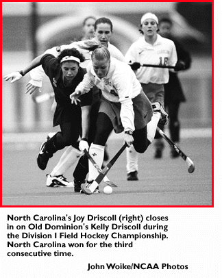 North Carolina tallied its third consecutive Division I Field Hockey Championship and fourth title overall with a 3-2 victory over Old Dominion November 23 at Connecticut.