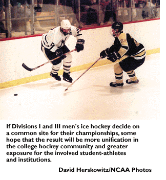 That's because the Division III Men's Ice Hockey Committee currently is reviewing a proposal from the Division I ice hockey committee that could result in the sport conducting its first common-site championship in 2000.