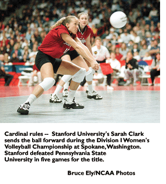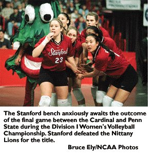 Paula McNamee contributed 20 kills and Sarah Clark added 18 for the Cardinal. Penn State was led by Terri Zemaitis, who planted 25 kills, compiled a .345 hitting percentage, posted a team-high 25 digs and was named the tournament's most outstanding player.