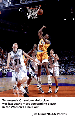 Overview: Tennessee is undefeated and looking to make it a "three-peat" this year. The most outstanding play-er in last year's Women's Final Four, Chamique Holdsclaw, continues to excel for the Lady Vols, averaging 22.9 points per game. Tennessee's closest game was against Alabama in February, a 73-66 win. The Lady Vols have recorded double-digit victories against probable championship challengers from Louisiana Tech, Stanford, Connecticut and Old Dominion this season .... With the loss of Nykesha Sales to an injury, Connecticut (28-2) will have to look to others to make up for the loss. Freshman Svetlana Abrosimova averages 14.5 points and 6.1 rebounds per game and will look to fill the shoes of Sales .... Louisiana Tech is led by Amanda Wilson and Alisa Burras. Both Lady Techsters are shooting more than 60 percent from the field .... Stanford has been in the top five most of the season. Senior Olympia Scott has been a big contributor in both scoring (18.2 ppg) and rebounding (7.8).