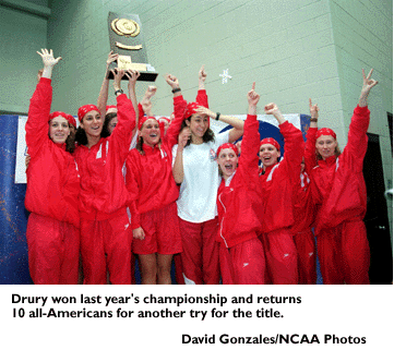 Overview: Drury returns 10 all-Americans from last year's team and looks to repeat as champion. Powerhouses Air Force and Oakland have left the Division II ranks for Division I, so challenges to Drury will come from Cal State Bakersfield, Truman State, Indiana (Pennsylvania) and Northern Michigan .... Drury's Viktoria Gadd, defending champion in the 100-, 200- and 500-yard freestyle events, looks to anchor this year's Panther team. Other key Panther swimmers are Cortney Martellucci in the 100- and 200-yard breaststrokes and the 200-yard individual medley, senior Gloria Ramos in the 100- and 200-yard butterfly events and distance swimmer Christina Tompkins .... Cal State Bakersfield hopes to improve on its best-ever sixth-place finish last year with the help of Karlyn Pepes-Neilsen (backstroke and individual medley) and Charli Shearard (butterfly and backstroke) .... Rachel Slade hopes to anchor Indiana to the title. Slade is ranked No. 1 individually in both the 100 and 200 butterflys .... Northern Michigan returns eight all-Americans, including sophomore standout Erin Vostad. She will compete in the 50- and 100-yard freestyle events and 200 and 400 medley relays. The Wildcats enter the championships after winning the Great Lakes Intercollegiate Athletic Conference championship.