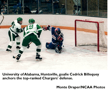 Overview: Alabama-Huntsville and Bemidji State have met in the championship three of the last four years, including the last two. The two appear destined to meet again. Alabama-Huntsville (20-3-3) sits atop the Division II poll. Two of the Chargers' three losses came against Division I Nebraska-Omaha. The Chargers are the essence of balance, netting 158 goals (6.08 per game) while permitting only 57 (2.19 per game). Defensively, Cedrick Billequey steadies a squad that has limited opponents to two goals or less in 17 of 26 contests. A junior, Billequey led the nation in goals-against average (1.80), save percentage (.931) and winning percentage (.933), while ranking second in wins (14). Offensively, John McCabe leads the team in scoring with 43 points, including a team-best 30 assists. Mike Hamlin is the Chargers' top goal-scoring threat, netting 23 goals, including seven power-play and four game-winning goals. Matt Parker sparks the Chargers' specialty teams, ranking among the nation's best in power-play goals (six) and shorthanded tallies (two) .... Defending champion Bemidji State (20-8-2 overall, 14-6 in the Northern Collegiate Hockey Association) has soared to the No. 2 ranking after opening with a 4-4-1 record. The Beavers, winners of five of the last six titles, showcase six players with 10 or more goals. Shane Kalbrener leads the team with 40 points, including a team-best 27 assists and five power-play goals, while Aaron Novak tops the team in goals (20). Josh Klingfus (31 points) and Calvin Chartrand (16 goals) add firepower to the Beavers' attack. Defensively, Bemidji State relies on sophomore goaltender Adam Pavlatos, who has guided the team to 18 wins in 26 contests. Pavlatos sports a goals-against average of 3.13 and a save percentage of .891. Beavers' coach Bob Peters earned career victory No. 700 January 17 against Wisconsin-Stout. Peters joined Michigan State's Ron Mason as the only NCAA coaches to compile 700 coaching wins.