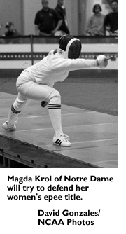 Overview: Three-time defending champion Penn State remains the team to beat. Top teams competing against Penn State for the title will be Columbia-Barnard, Notre Dame, St. John's (New York) and Stanford .... Penn State's Ola Korfanty and Charlotte Walker will compete in women's epee, along with defending women's epee champion Magda Krol and Nicole Mustilli of Notre Dame and Nealia Mann and Jessica Lisagor of Stanford. Nicole Dygert of St. John's, 1996 women's epee champion and 1997 runner-up, also will have her sights set on the epee championship .... Women's foil will be up for grabs. Notre Dame's Sara Walsh, last year's runner-up, returns to compete against 1997 champion Yelena Kalkina of Ohio State, teammate Patricia Szelle, and Stanford's Felicia Zimmermann and Monique DeBruin, who placed above Kalkina and Szelle in last year's round-robin standings. Also, Susan Jennings and newcomer Erinn Smart of Columbia-Barnard and Yale's Allison Calabia will be contenders .... In the men's events, watch for sophomore Keeth Smart of St. John's to attempt to repeat as sabre champion. He will defend the title against Penn State's Aaron Stuewe and Notre Dame's Luke LaValle .... Contenders for men's foil should include defending champion Cliff Bayer of Pennsylvania, Peter Devine of Yale, Dan Kellner of Columbia, Tim Chang and Alex Wood of Stanford, Gang Lu and Donald McGill of Penn State, and John Tejada of Notre Dame .... Last year's runner-up in men's epee, George Hentea of St. John's, will battle again for the title against competitors like freshman teammate and newcomer Alex Roytblat, Notre Dame's Carl Jackson and Duke's Jeremy Kahn, men's epee champion in 1996.