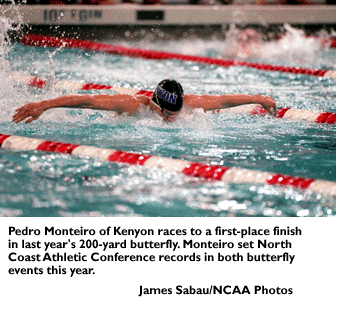 Overview: "Times are changing" isn't a phrase you hear in Division III men's swimming and diving. Kenyon will return to the championships as the favorite after winning every meet since 1980. After losing last year's North Coast Athletic Conference meet, the Lords rebounded to win their 18th straight Division III title, and now have restored order in league competition with their recent victory over Denison, 993-905. Senior Pedro Monteiro leads this year's squad. Monteiro set conference records in both butterfly events, placed first in the 100-yard backstroke and was a member of the Lords' record-setting medley relays. Overall, the Lords return 14 all-Americans from last year's squad, along with an impressive freshman class. Coach Jim Steen will look to his relay teams to again swim record times, just as they did in the conference championships .... Contenders for the title include UC San Diego, which finished second at last year's championship; Denision; and Williams. Williams will bring a younger squad to this year's championships. The team is led by Cyrus King, who will look to make an impressive showing in the butterfly events and in the 1,650-yard freestyle.