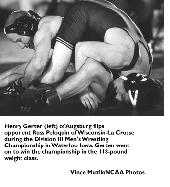Henry Gerten repeated as 118-pound champion and Jim Peterson won the 167-pound class as Augsburg romped to its second consecutive Division III Wrestling Championships title and its third in the last four years March 7 at Young Arena in Waterloo, Iowa.