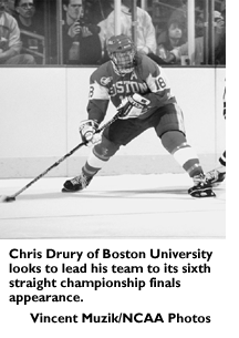 Overview: North Dakota seeks to become the first team to win consecutive titles since Boston U. in 1971-72. The Western Collegiate Hockey Association regular-season champions, the Fighting Sioux (27-6-1) are led by Jason Blake (21 goals, 25 assists, 46 points) and Curtis Murphy (7-33-40) .... Challengers to North Dakota's reign include Boston U., Michigan State and Yale. The Hockey East Association regular-season champion, Boston U. (27-5-2), looks to advance to the national finals for the sixth consecutive year. The Terriers are led by Chris Drury (24-27-51) and Tom Poti (14-29-43) .... Michigan State (27-5-5) and coach Ron Mason -- the only coach to win 800-plus games -- earned an automatic berth by claiming the Central Collegiate Hockey Association regular-season crown. Sean Berens (32-17-49) leads the Spartans offensively, while goaltender Chad Alban (20-3-4 record, 1.56 goals-against average) backstops the defensive effort .... Yale (22-6-1), the Eastern College Athletic Conference regular-season champion, will compete in the tournament for the first time since 1952. Yale is led by Jeff Hamilton (25-18-43) and goaltender Alex Westlund (19-6-1 record, 2.24 goals-against average).