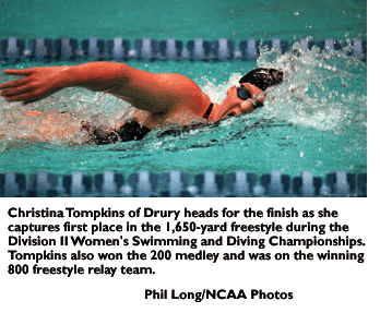 Drury was led by Christina Tompkins, who won the 1,650-yard freestyle, 200 medley and was part of the winning 800 freestyle relay team.