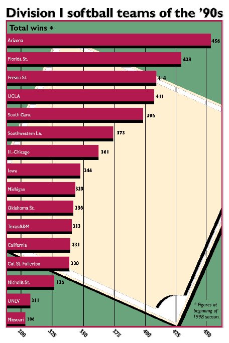 When it comes to winning in Division I women's softball, no team has done it quite like Arizona. The Wildcats not only had the most wins in the '90s at the beginning of this season (456), but they also had the best winning percentage (.865). The Wildcats have won five of the eight national championships contested in the '90s. The others went to UCLA, the second winningest team in percentage.