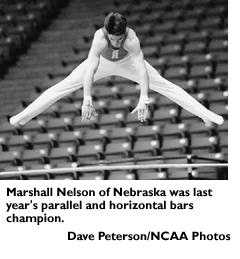 Overview: California will look to repeat as champion this year. Leading the way for the Golden Bears will be Evgenii Zherebchevskiy. Backing up Zherebchevskiy are teammates Josh Brickelbaw and Oleg Kosiak .... No. 1-ranked Nebraska will be looking for a team championship with a seven-man roster. At the forefront of Nebraska's effort will be all-arounders Derek Leiter, Bill Mulholland and freshman Jason Hardabura, along with last year's parallel bars and horizontal bar champion, Marshall Nelson .... Iowa, the No. 2-ranked team in the nation, will be looking for its second championship and first since 1969. Guiding the Hawkeyes in their quest are all-arounders Todd Strada and Chris Camiscioli, with floor exercise specialist Brian Hamilton .... Ohio State will also present strong competition for the title with Michael Morgan, ranked first in the nation on the floor exercise; Jamie Natalie, ranked in the top 10 of four events; and Doug Stibel .... Michigan will compete for honors with all-arounder Kevin Roulston, whose strength is on the floor exercise, and all-arounder La Lo Haro, who will contend for the parallel bars individual title .... 1997 second-place finisher Oklahoma is ranked third in its region and has the No. 1-ranked still ring performer, Dan Fink. Teammates Andy Howard, Brendan O'Neil, Robby Rome and Todd Bishop, who is ranked in the top three nationally in the parallel bars, pommel horse and horizontal bar, will contribute to Oklahoma's effort .... Illinois' Travis Romagnoli, who tied for third in last year's all-around championship, will vie for the individual title with his top-ranked regional qualifying average. Kendall Schiess of New Mexico will strive for the pommel horse crown after posting a second-place finish in 1997.