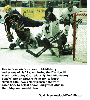 Filip Jirousek and Nickolai Bobrov each tallied goals, and the goaltending duo of Francois Bourbeau and Chris Farion combined to stymie Wisconsin-Stevens Point as Middlebury won an unprecedented fourth consecutive Division III Men's Ice Hockey Championship March 21 at Plattsburgh State.
