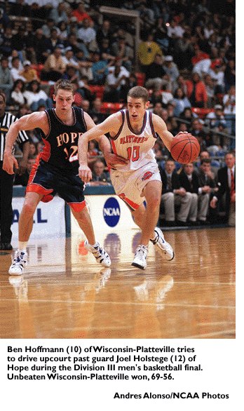 The Pioneers upped the lead to 20 by the first timeout of the second half. Hope's Joel Holstege, who led all scorers with 26 points, scored two straight layups late in the game to cut the margin to 11 at 62-51. After Andre Dalton converted two free throws and Fuhrmann scored off of a length-of-the-floor pass for Wisconsin-Platteville, Hope's Pat Stegeman hit a three-pointer to pull the Flying Dutchmen to within 12 at 66-54.
