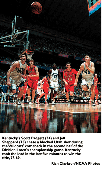 Kentucky trailed, 41-31, at the break, but -- just like in victories over Duke in the South regional final and Stanford in the national semifinals -- the Wildcats clawed back to win. Coach Tubby Smith's squad converted stamina, cat-quick defense and a 58-percent second-half shooting percentage from the floor into the school's seventh championship and second in three years.