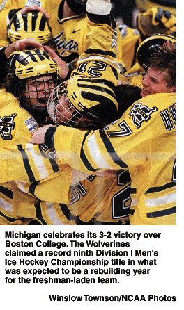 Freshman Josh Langfeld scored at 17:51 in overtime and goaltender Marty Turco turned aside 28 shots as Michigan edged Boston College, 3-2, to win the Division I Men's Ice Hockey Championship April 4 at the FleetCenter.