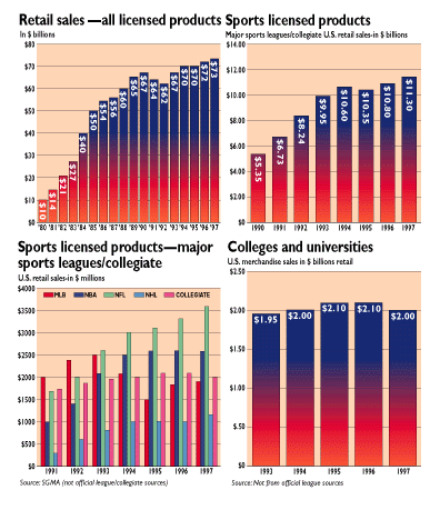 An annual report by the Sporting Goods Manufacturers Association says that the overall sports-licensed product market has entered a period of stability after a decade of steady growth through the 1980s and slower growth throughout the mid '90s. The SGMA estimates that U.S. retail sales of sports-licensed products for the NBA, NFL, Major League Baseball, NHL and college/universities amounted to $11.3 billion in 1997, a 4.6 percent increase from 1996. The SGMA noted that the college/university market experienced stronger regional buying in 1997.
