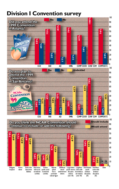 The Division I membership is taking a wait-and-see attitude on whether to attend the 1999 NCAA Convention in San Antonio. A survey of Division I members showed that 45 percent of those responding had not decided whether to attend next year's event. Of those responding, 76 percent attended the 1998 Convention in Atlanta.