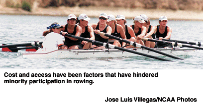 Rowing was an emerging sport two years ago, which meant that institutions were allowed to use rowing to help meet the NCAA minimum sports-sponsorship requirements and the NCAA's minimum financial aid awards. The goal is to provide additional athletics opportunities for women, but ironically, emerging sports (women's ice hockey and women's water polo are the next likely candidates) are actually diluting the overall participation numbers for minorities.