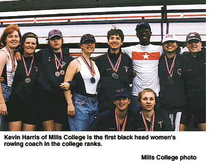 Here's a brain teaser: (1) Mills College is a Division III women's school in Oakland, California. (2) Rowing is a sport with primarily white ethnic roots. (3) Kevin Harris is an African-American graduate of George Washington University. (4) Kevin Harris is Mills' head rowing coach.