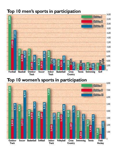 Football has the most participants of any men's sport in any division. Almost 53,000 student-athletes participate in football overall, with 23,680 taking part in Division I. Among women's sports, participation varies from division to division. Track and field is most popular in Division I, softball in Division II and soccer in Division III.