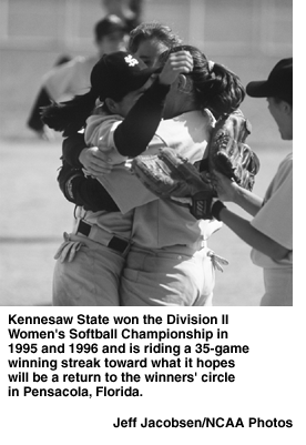 Overview: Coker is looking to make its second appearance in the championship and is going for gold. Coker has had a phenomenal season, compiling a 50-1 record. The Cobras started their season by going 38-0 -- the second longest winning streak in Division II softball history and Coker's best-ever start in a season. Senior third baseman Kelly Norris leads all active NCAA Division II players in career doubles and is high on the charts of career home runs, career runs batted in and career hits. Norris is only the second player in Division II softball history to exceed 300 career hits and 200 career runs batted in. Pitcher Missy Paterson ranks third in Division II in career strikeouts and is only the second player in Division II to reach the 1,000-strikeout mark in her career. Sophomore Angela Williams has a .565 batting average in an 11-game stretch .... Challenging for championship honors, Kennesaw State is on a 35-game winning streak. The Owls have a 46-1 record for the season. Senior pitcher Brenda Farrell is ranked in the top 10 in three national pitching categories. Also on the mound for the Owls is freshman Christina Caldwell. Caldwell also ranks high in national rankings with a 0.66 earned-run average and an 18-0 win-loss record. Senior centerfielder Shannon McDonough has a .480 batting average and leads her team with nine triples this season .... Top-ranked Humboldt State is seeking its first championship title and is worthy for battle after posting a 55-5 record for the season -- a school record. Sophomore leftfielder Talisha Pleasant has broken the Lumberjacks' single-season home run record with her tally of 12. Junior centerfielder Jamie Peterson has 46 stolen bases for the season and totals 106 for her career .... Merrimack is searching for its second championship title. Shortstop Stacey Dell'anno, pitcher Carrie Ladebauche, pitcher Jennifer Connolly, first baseman Lana Gazone, pitcher/designated player Julie Phipps and second baseman Heather Faria have their sights set on victory.