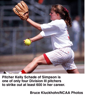 Overview: Simpson hopes to repeat as champion of Division III softball. Top performers for the Storm include pitcher Kelly Schade. At 21-2, Schade has struck out 210 batters in 1541/3 innings. Schade has an 0.41 earned-run average and is only the fourth pitcher in Division III history to strike out at least 600 in a career. In 20 starts, Schade has thrown 19 complete games, and her 15 shutouts are tied for fourth on the national single-season shutout list. Schade has pitched four no-hitters this season. Dee Wischmeier is hitting .347 for the season and has 21 runs batted in. Michelle Fowler is hitting .443 for the Storm and sophomore shortstop Jenny Young is leading the team in hitting at .444 .... Attempting to steal the title from Simpson will be Webster. Tara Horn is leading the Gorloks with a .511 batting average. Katie Maynard is batting .448. Maynard and Horn both have tallied four home runs for the season. Pitcher Jeanne Zes is 12-1 with a 1.00 earned-run average .... Wisconsin-Whitewater wants to win one for the coach in its ninth appearance in the tournament. The Warhawks' head coach, Irv Madsen, will retire at the end of the season. Outfielder/catcher Sarah Kraus is on track to set the school record for season batting average. She is batting .529. Pitcher Laura Hering is tied for second in career wins (46), is fifth in strikeouts (121) and leads the league in victories. Valerie Kerkman is tied for sixth in career hits (125), ranks third in runs (99) and is third in the league in runs batted in. Outfielder Megan Kerkman is tied for third in the Wisconsin-Whitewater record books for runs scored in a season (33) ..... Other championship contenders include St. Mary's (Minnesota), Alma, Geneseo State, Daniel Webster and Fairleigh Dickinson-Madison.