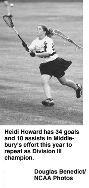 Overview: Last year represented a changing of the guard, as Middlebury became the first team other than College of New Jersey to win the title since 1991. The Panthers have taken off again this year, winning their first six games -- the first four on the road -- before bowing to perennial championship challenger William Smith, 12-11. Middlebury is third in scoring offense nationally, averaging 17.86 goals per game. The key players behind that stat have been Heidi Howard (34 goals and 10 assists) and Lina Chickering (33 goals and seven assists) .... College of New Jersey is well on its way to posting its eighth straight undefeated regular season, having won its first seven games. Only two teams, Johns Hopkins (9-7 in overtime) and Franklin and Marshall (12-9), have kept the winning margin under six goals. Dana Latona has 25 goals and 14 assists to lead the Lions .... Trinity (Connecticut) was undefeated after its first seven games, with the most impressive win coming against William Smith, 17-15 (the Herons' only loss). Trinity is the nation's top-ranked offensive team, averaging 19.29 goals per game .... Johns Hopkins, which has made the semifinals five times but never advanced to the championship game, has lost twice, but one of those setbacks was against Division I No. 1 North Carolina in its opener. The Blue Jays' only Division III loss was to College of New Jersey in overtime, 9-7. Danielle Maschuci leads the Blue Jays in scoring with 36 goals and 20 assists. She is ninth in the nation in assists per game (1.89).