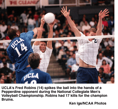 Adam Naeve, the tournament's most outstanding player, led a balanced Bruin attack with 23 kills. Evan Thatcher added 21 and Tom Stillwell had 18. Fred Robins and Brian Moselle rounded out the attack with 17 and 15 kills, respectively.