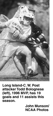 Overview: For the first time, the game will be played as part of the sport's Championships Weekend .... Long Island-C. W. Post beat Adelphi, 9-8, on April 18. Post stormed back from three goals down with seven minutes left. The team that won the regular-season meeting has lost the championship rematch in each of the last three years. Post coach Tom Postel expects a higher scoring game this time around, mainly because of an increased number of unsettled situations that might come from the combination of a long layoff and hot weather. Post's only setback came against two-time defending Division III champion Nazareth, 11-10. Goalkeeper Vin Fredericks leads the nation's top-ranked defense, ranking first in both goals-against average (6.13) and save percentage (.683). Gavin Chamberlain (24 goals, 18 assists), Charlie Jaworsky (26, 6) and Todd Bolognese (19, 11) lead the offense. Bolognese was MVP in the 1996 championship game, when the Pioneers beat Adelphi, 15-10 .... Adelphi is ranked second behind Post in scoring defense but gives up an average of 1.36 more goals per game. Junior Greg Kulesa ranks second in goals-against average (7.29) and eighth in saves percentage (.629). Offensively, the Panthers rank sixth in scoring offense (14.57 goals per game). Most of their punch lies with two players -- Mark Mangan (42 goals, 28 assists) and Anthony Picone (33, 24). Picone also is the team's top faceoff man, with his team controlling the ball more than 65 percent of the time. "I'm hoping we pro-duce more offensively," said coach Sandy Kapatos. "If I had been told before the first game that we would hold them to nine goals, I would have expected to win." The Panthers' two other losses were to Division III Hartwick and Salisbury State.