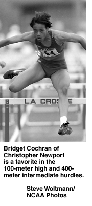 Overview: It's been three years since Christopher Newport ended the outdoor track and field season as the nation's top team. The Captains are seeking to conclude the 1998 outdoor season as they did the indoor season: No. 1. Christopher Newport certainly has the talent to complete the championships sweep. The Captains boast what arguably is the division's strongest sprints corps, which includes defending 100-meter dash champion Leema Madden and two-time 100-meter high hurdles champion Bridget Cochran, who, as of May 5, posted the nation's top qualifying marks in the 100-meter high and 400-meter intermediate hurdles. Cochran is vying to become the first competitor to win three consecutive 100-meter high hurdles titles. Joining Madden and Cochran will be Denita Eason (200- and 400-meter dashes and long jump) and Jenita Harris (100-meter high and 400-meter intermediate hurdles). The Captains will also look for points in the relays, where Cochran, Eason, Tamika Lomax and Madden registered the top mark in the 400 relay; and Cochran, Eason, Madden and Fanetta Malin recorded the top qualifying time in the 1,600 relay .... Wisconsin-La Crosse, which finished runner-up to three-time defending champion Wisconsin-Oshkosh in 1997, has its sights set on its first title in 13 years. The Eagles showcase the top hammer-throw qualifier in Patti Franckowiak, along with Shamaine Martin (800-meter run), Jenni Rider (shot put) and the 1,600 relay team of Martin, Katie O'Leary, Jenni Porter, and Lace Van Zeeland. Martin, Porter and Van Zeeland guided the Eagles to the 1997 event title .... Wisconsin-Oshkosh, which has won five titles and placed second three times in the past nine championships, seeks an unprecedented fourth straight title. The Titans will place their title hopes behind Mary Bunker (heptathlon), Kenya Moore (triple jump), Tiffany Ebensperger (5,000-meter run) and Rachel Milligan, who posted the top qualifying marks in the 800- and 1,500-meter runs.