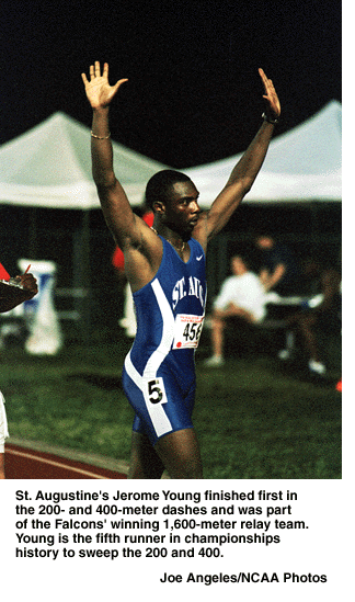 Jerome Young swept the 200- and 400-meter dashes, and St. Augustine's received points from eight individuals, including double-digit points from five competitors, to stun the field May 21-23 at Southern Illinois-Edwardsville.