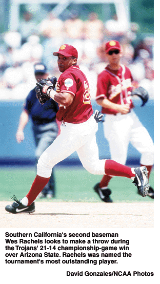Southern California scored five more runs in the sixth and seventh innings to take a 14-8 lead. Rachels added an RBI double in the sixth and a two-run single in the seventh. Rachels finished with five hits and seven runs batted in, a record for the CWS championship game.