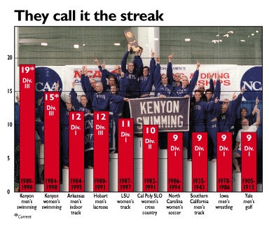 When it comes to winning NCAA championships, nobody does it quite like the Kenyon College swimmers. This year, the Lords (pictured above) won their 19th consecutive Division III Men's Swimming and Diving Championships while the Ladies took home a 15th consecutive women's title. The streaks rank first and second on the all-time list of consecutive NCAA team championships.