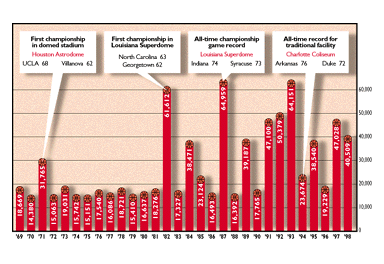 The NCAA Division I Men's Basketball Committee recently recommended sites for the 2003 through 2007 Final Fours: 2003, April 5 and 7, New Orleans; 2004, April 3 and 5, San Antonio; 2005, April 2 and 4, St. Louis, 2006, April 1 and 3, Indianapolis, 2007, March 31 and April 2, Atlanta. Other future sites include St. Petersburg, Florida, in 1999; Indianapolis in 2000; Minneapolis in 2001; and Atlanta in 2002. All of the future sites feature domed facilities that seat more than 40,000. The table above shows final-game attendance since official records began being kept in 1969. All championship-game attendance exceeding 30,000 has been in a domed stadium. The most recent final not conducted in a domed facility was in 1996 when Kentucky defeated Syracuse at what is now Continental Airlines Arena in East Rutherford, New Jersey.