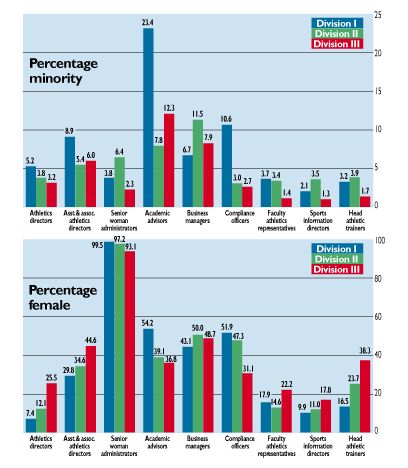 Figures do not include historically black institutions. A recent two-year study by the NCAA Minority Opportunities and Interests Committee shows, among other things, the race and gender demographics of administrative personnel at NCAA Divisions I, II and III institutions. The position with the highest percentage of minority administrators was academic advisor in Division I (23.4 percent -- almost double the rate for any other administrative position in any division). Aside from the senior woman administrator position, the administrative positions with the highest percentage of women were academic advisors, business managers and compliance officers.
