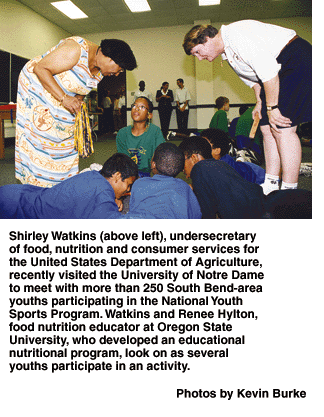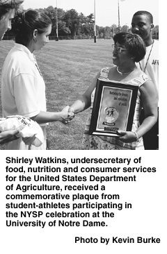 As part of the festivities at an NYSP 30th anniversary celebration at the University of Notre Dame, Shirley Watkins, undersecretary of food, nutrition and consumer services for the United States Department of Agriculture, announced a policy change that will make it much easier to provide for NYSP programs to use the USDA's Summer Food Services Program.