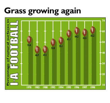The percentage of Division I-A institutions playing football on a natural surface is the highest it has been since the subdivision was established in 1978. The move toward grass actually declined in 1997, mostly because several institutions with artificial surfaces moved their programs from Division I-AA to I-A. This year, however, there were no additions to the subdivision nor was there any institution replacing a grass surface with an artificial one. Three institutions -- Baylor University; Indiana University, Bloomington; and the University of Louisville -- switched to natural surfaces. According to the 1998 edition of NCAA Football, the official record book of college football, Division I-A now contains 112 members, 73 of which (65.2 percent) play on a natural surface. The trend toward grass began in the mid '80s and has gained momentum since the beginning of this decade. Current Division I-A teams using grass surfaces Air Force, Alabama, Alabama-Birmingham, Arizona, Arizona State, Arkansas, Arkansas State, Auburn, Ball State, Baylor, Bowling Green, Brigham Young, California, Central Florida, Clemson, Colorado State, Duke, East Carolina, Florida, Florida State, Fresno State, Georgia, Georgia Tech, Indiana, Iowa, Iowa State, Kentucky, LSU, Louisiana Tech, Louisville, Maryland, Memphis, Miami (Florida), Miami (Ohio), Michigan, Mississippi, Mississippi State, Missouri, Navy, Nevada, New Mexico, New Mexico State, North Carolina, North Carolina State, Northeast Louisiana, Northwestern, Notre Dame, Ohio, Ohio State, Oklahoma, Penn State, Purdue, Rutgers, San Diego State, San Jose State, South Carolina, Southern California, Southern Methodist, Southern Mississippi, Southwestern Louisiana, Stanford, Tennessee, Texas, Texas A&M, Texas Christian, UCLA, Utah, Utah State, Virginia, Virginia Tech, Wake Forest, Western Michigan, Wyoming. Current Division I-A teams using artificial surfices Akron, Army, Boise State, Boston College, Central Michigan, Cincinnati, Colorado, Eastern Michigan, Hawaii, Houston, Idaho, Illinois, Kansas, Kansas State, Kent, Marshall, Michigan State, Minnesota, Nebraska, UNLV, North Texas, Northern Illinois, Oklahoma State, Oregon, Oregon State, Pittsburgh, Rice, Syracuse, Temple, Texas Tech, Toledo, Tulane, Tulsa, UTEP, Vanderbilt, Washington, Washington State, West Virginia, Wisconsin.