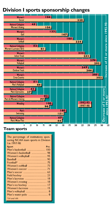 Division I sports sponsorship changesFour sports were sponsored by more than 90 percent of the Division I membership in 1997-98: men's basketball, women's basketball, women's volleyball and baseball. Football, women's softball and men's and women's soccer all are sponsored by more than 60 percent of the institutions in the division. The fastest growth has occurred in women's soccer, which is sponsored by 124 more institutions than in 1992-93. Women's rowing has grown at a similar rate, jumping from 42 institutions in 1992-93 to 104 institutions in 1997-98. The most significant decreases in sponsorship have been in men's gymnastics, men's and women's fencing, wrestling, and men's swimming and diving.