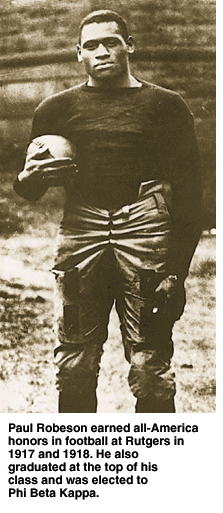 Brown's book,"The Young Paul Robeson," quotes Robeson's recollections of that first day of football practice: "Well, that night I was a very, very sorry boy. Broken nose, shoulder thrown out, and plenty of cuts and bruises. I didn't know whether I could take any more. But my father -- my father was born in slavery down in North Carolina -- had impressed me that when I was out on a football field or in a classroom or just anywhere else, I wasn't there just on my own. I was the representative of a lot of Negro boys who wanted to play football and wanted to go to college, and, as their representative, I had to show that I could take whatever was handed out."
