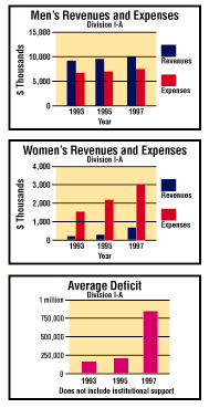 The study showed that in Division I-A, 43 percent of all programs reported revenues (after removing institutional support) over expenses. That figure is consistent with recent trends. In the 1993 study, it was 51 percent, and in 1995, it was 46 percent. Also, the percentage of I-A institutions with expenses exceeding revenues continued to increase. That figure was 49 percent in 1993, 52 percent in 1995 and 56 percent in 1997.
