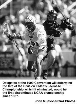 At the 1999 NCAA Convention, delegates will vote on whether to eliminate the Division II Men's Ice Hockey Championship and whether to continue the Division II Men's Lacrosse Championship.