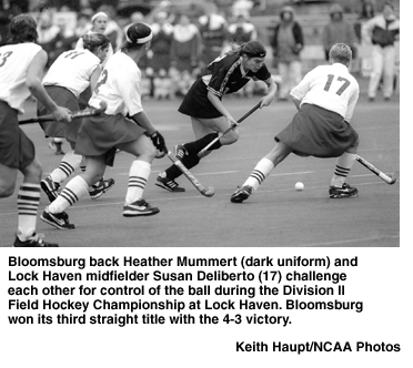 Bloomsburg became the first team to claim three consecutive NCAA Division II Field Hockey Championships with a 4-3 overtime victory over Lock Haven November 8.