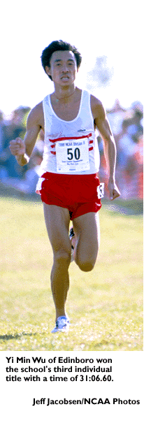 Wu gave Edinboro its third individual title and first since 1991, cruising to a time of 31:06.60. The mark was nearly 10 seconds ahead of runner-up Musa Gwanzura of Abilene Christian (31:16.50), who jumped 13 spots after a 15th-place showing in 1997.