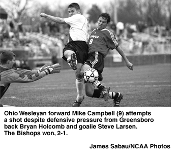 Ohio Wesleyan's Mike Campbell scored the game-winner off a pass from Jason Chadima along the top of the box. Campbell took the ball alongside the goal line and shot the ball into the top right corner of the goal just beyond the reach of Greensboro goalkeeper Steve Larsen.
