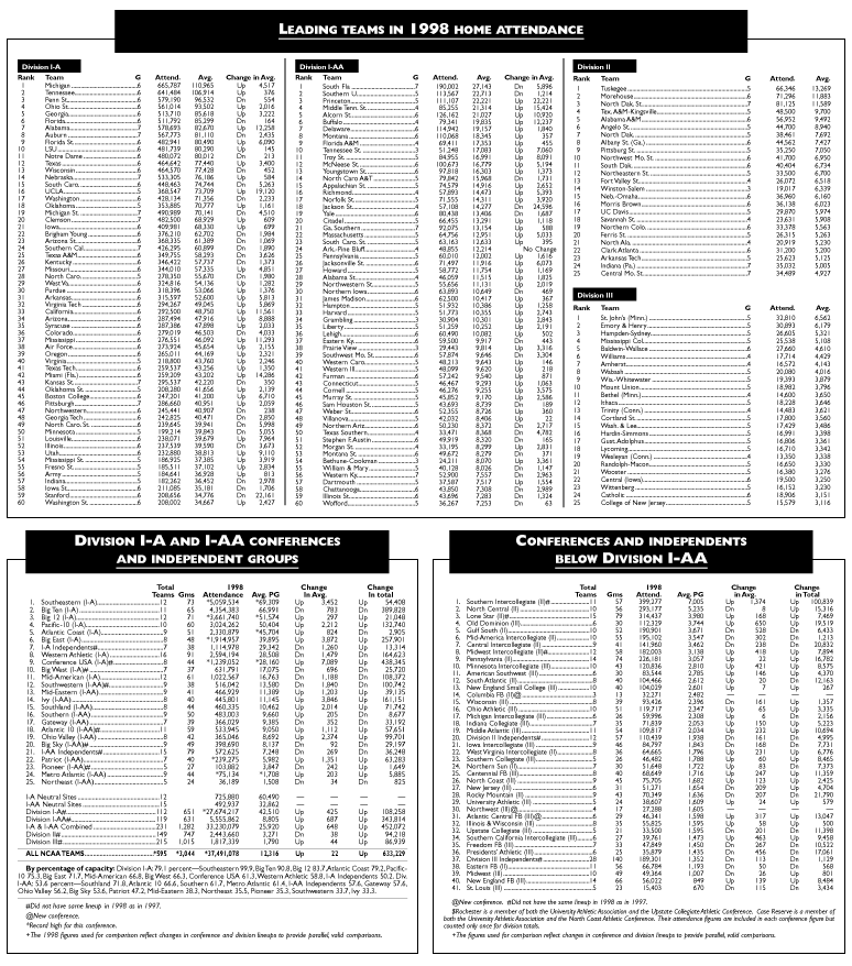Home-game attendance totals for 1998 were 37,491,078 for the four divisions and subdivisions, a jump of more than 600,000 fans from 1997. Division I-A totaled a record 27,674,217 fans, an average of 42,510 per game and a jump of more than 100,000 in total attendance from the previous mark set last year.