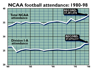 Perhaps buoyed by interest in the Bowl Championship Series, college football attendance in 1998 soared over the 37 million mark for the first time.