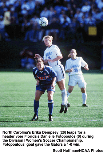 The second-seeded Gators defeated the top-seeded Tar Heels in front of a tournament-record crowd of 10,583. Florida's Danielle Fotopoulos, the NCAA's all-time leading scorer in women's soccer, posted the game-winning goal in the sixth minute of play. Her left-footed direct kick from the right side of the box cleared a wall of North Carolina defenders and hit the crossbar before dropping over the goal line to the left side of the goal.