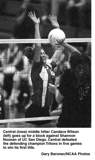 Central (Iowa) claimed its first Division III Women's Volleyball Championship by outlasting defending titlist UC San Diego, 15-10, 12-15, 15-6, 8-15, 15-13, December 6 at Juniata.